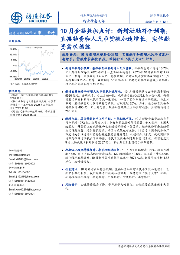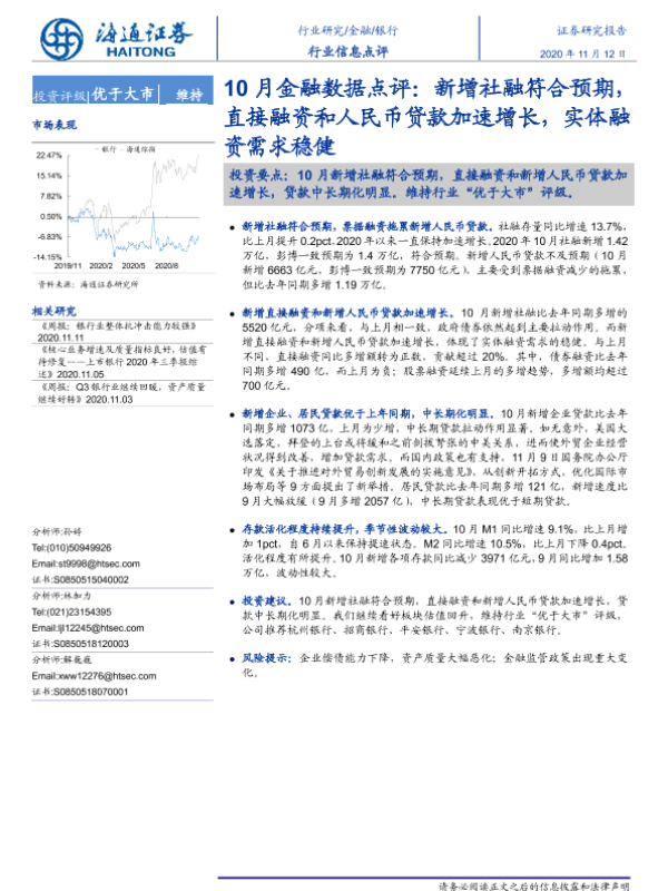 【海通证券】【20201112】银行10月金融数据点评:新增社融符合预期,直接融资和人民币贷款加速增长,实体融资需求稳健-3页