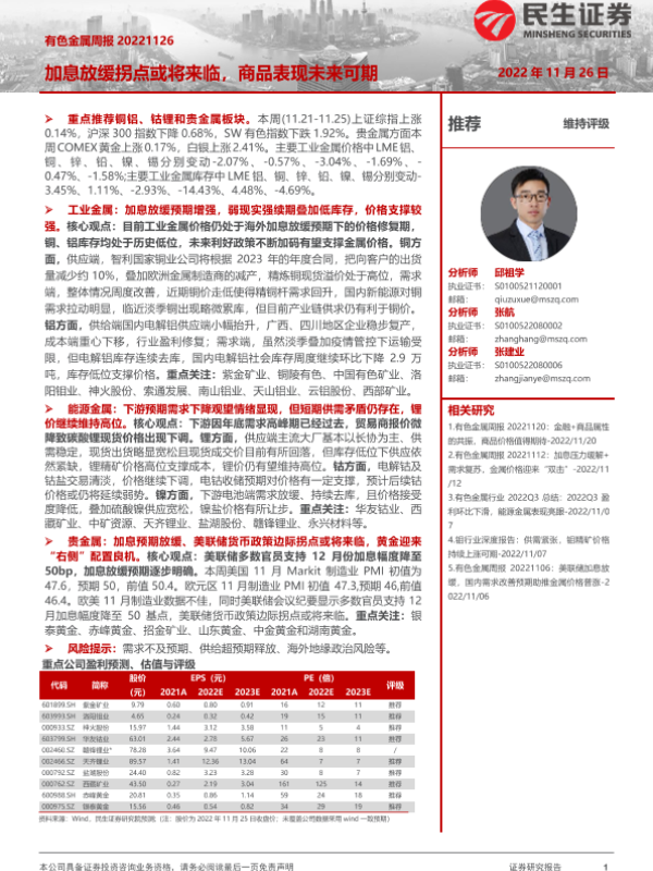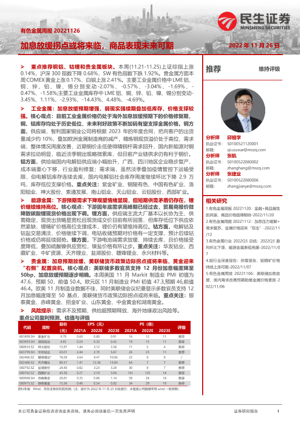 【民生证券】【20221126】有色金属周报:加息放缓拐点或将来临,商品表现未来可期-26页
