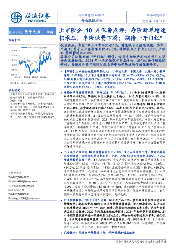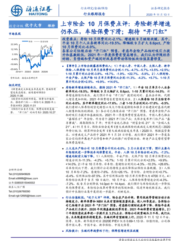 【海通证券】【20201113】上市险企10月保费点评:寿险新单增速仍承压,车险保费下滑;期待“开门红”-5页