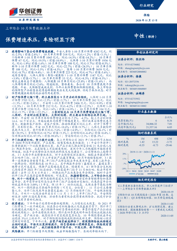 【华创证券】【20201113】上市险企10月保费数据点评:保费增速承压,车险明显下滑-7页