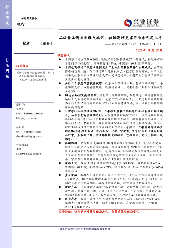 【兴业证券】【20201115】二级资本债首次触发减记,社融高增支撑行业景气度上行-12页