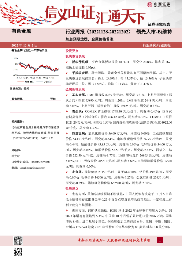 【山西证券】【20221202】有色金属行业周报:加息预期放缓,金属价格普涨-19页