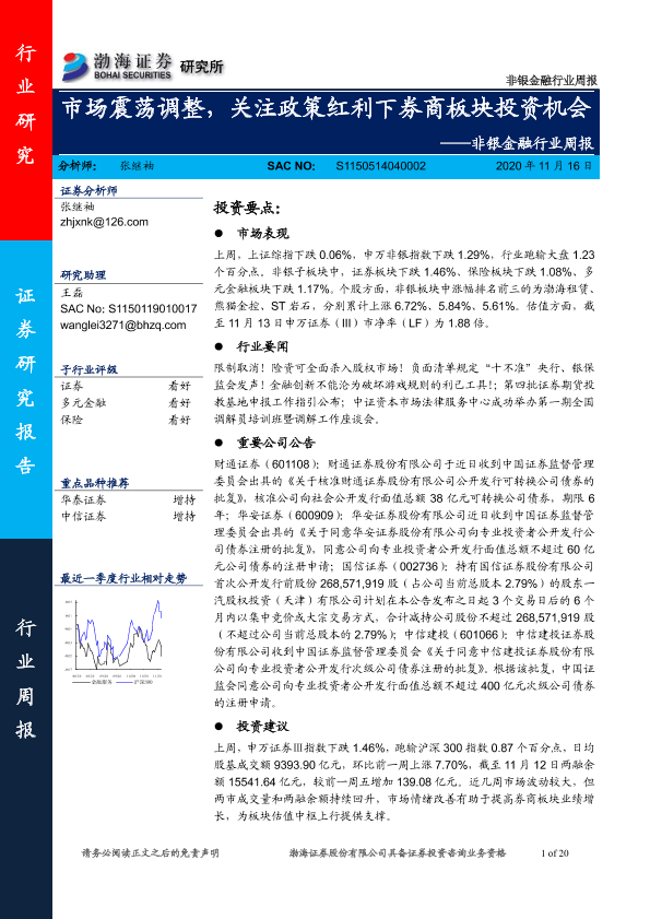【渤海证券】【20201116】非银金融行业周报:市场震荡调整,关注政策红利下券商板块投资机会-20页