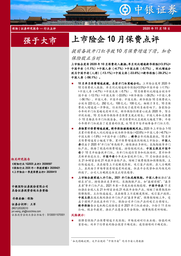【中银证券】【20201118】上市险企10月保费点评:提前备战开门红导致10月保费增速下滑,加仓保险股正当时-7页