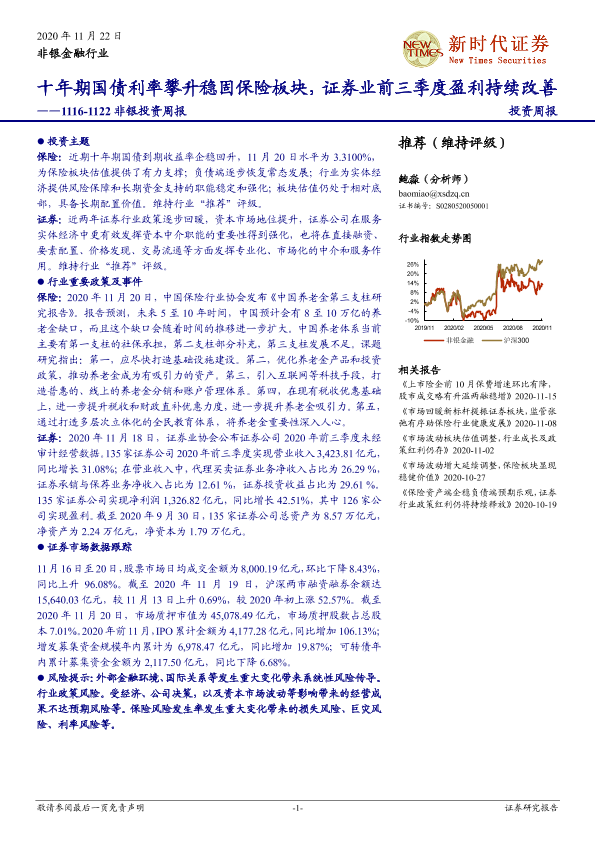 【新时代证券】【20201122】十年期国债利率攀升稳固保险板块,证券业前三季度盈利持续改善-12页