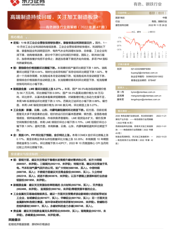 【东方证券】【20221128】有色钢铁行业周策略(2022年第47周):高端制造持续回暖,关注加工制造板块-40页