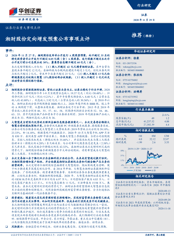 【华创证券】【20201129】证券行业重大事项点评:湘财股份定向增发预案公布事项点评-4页