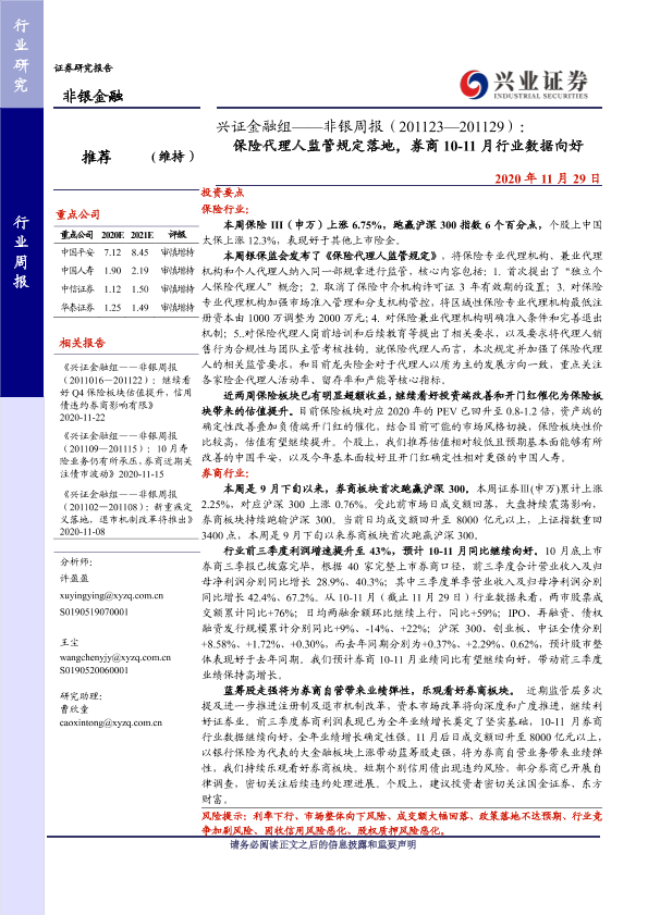 【兴业证券】【20201129】非银周报:保险代理人监管规定落地,券商10-11月行业数据向好-11页
