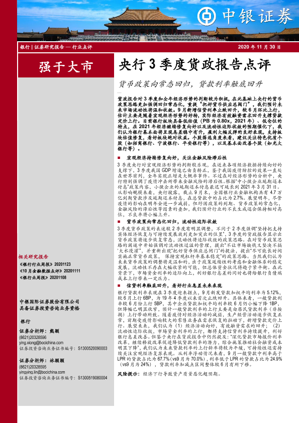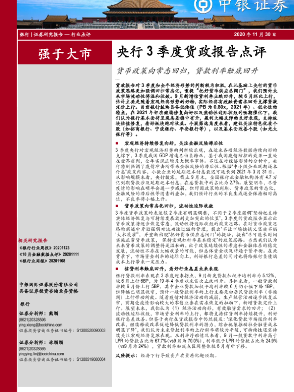 【中银证券】【20201130】央行3季度货政报告点评:货币政策向常态回归,贷款利率触底回升-7页