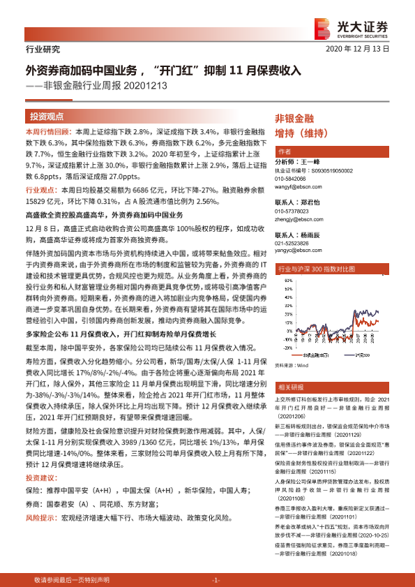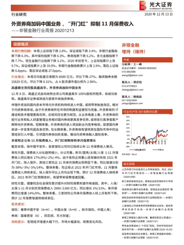 【光大证券】【20201213】非银金融行业周报:外资券商加码中国业务,“开门红”抑制11月保费收入-13页