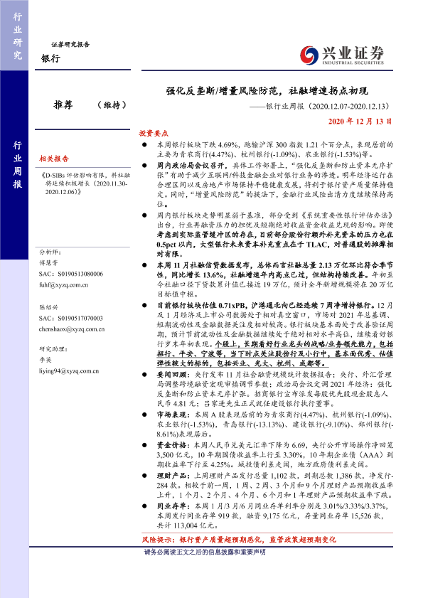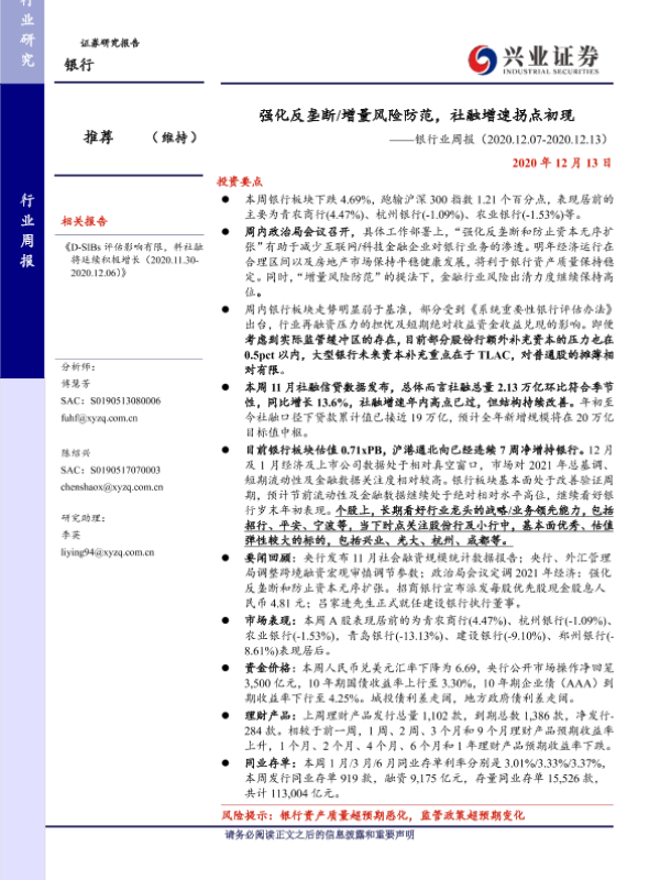 【兴业证券】【20201213】银行业周报:强化反垄断 增量风险防范,社融增速拐点初现-13页