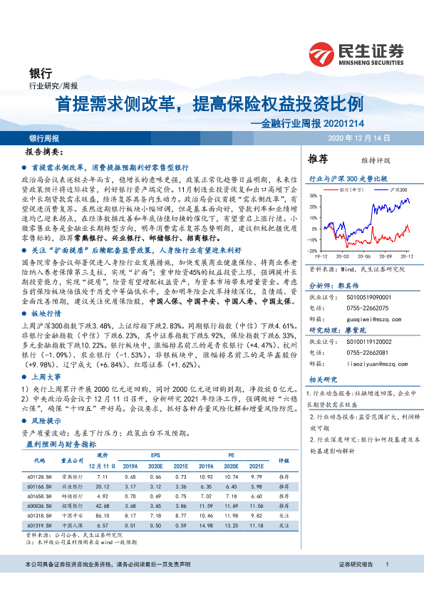 【民生证券】【20201214】金融行业周报:首提需求侧改革,提高保险权益投资比例-21页