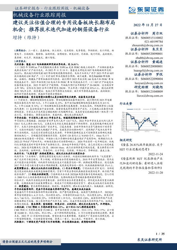 【东吴证券】【20221127】机械设备行业跟踪周报:建议关注估值合理的专用设备板块长期布局机会;推荐技术迭代加速的铜箔设备行业-35页