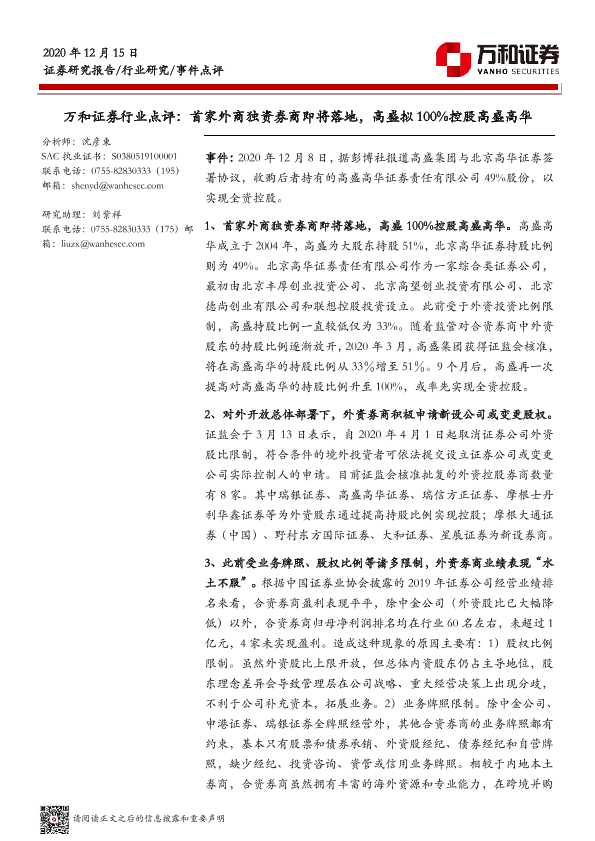 【万和证券】【20201215】证券行业点评:首家外商独资券商即将落地,高盛拟100%控股高盛高华-4页