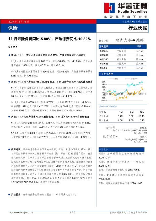 【华金证券】【20201216】11月寿险保费同比-5.80%,产险保费同比-10.82%-5页