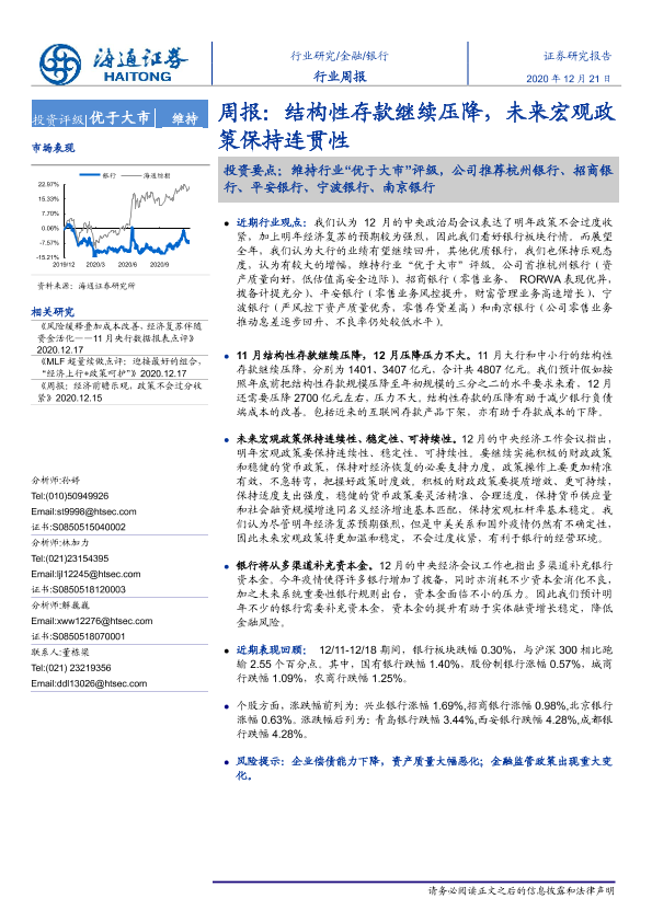 【海通证券】【20201221】银行行业周报:结构性存款继续压降,未来宏观政策保持连贯性-8页