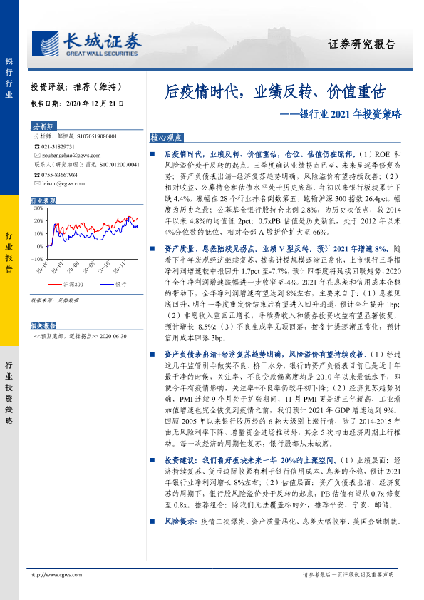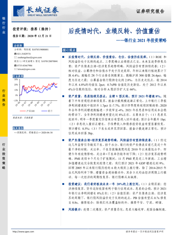 【长城证券】【20201221】银行业2021年投资策略:后疫情时代,业绩反转、价值重估-18页