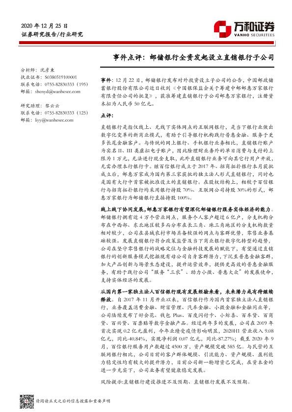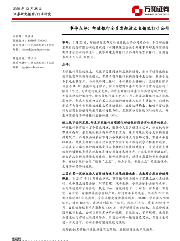 【万和证券】【20201225】银行行业事件点评:邮储银行全资发起设立直销银行子公司-2页
