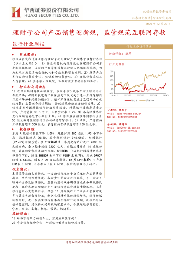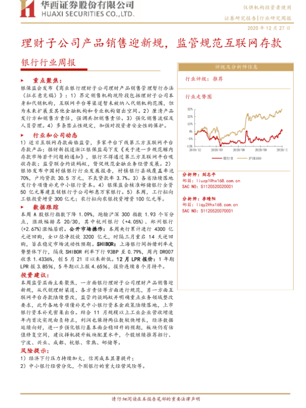 【华西证券】【20201227】银行行业周报:理财子公司产品销售迎新规,监管规范互联网存款-8页