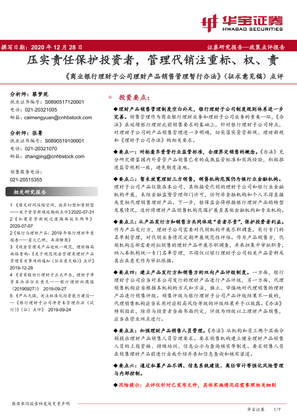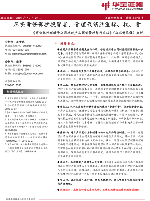 【华宝证券】【20201228】《商业银行理财子公司理财产品销售管理暂行办法》(征求意见稿)点评-7页