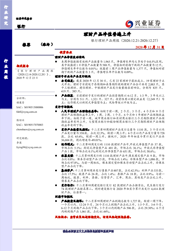 【兴业证券】【20201231】银行理财产品周报:理财产品净值普遍上升-20页