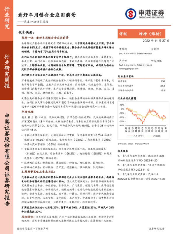 【申港证券】【20221127】汽车行业研究周报:看好车用镁合金应用前景-15页
