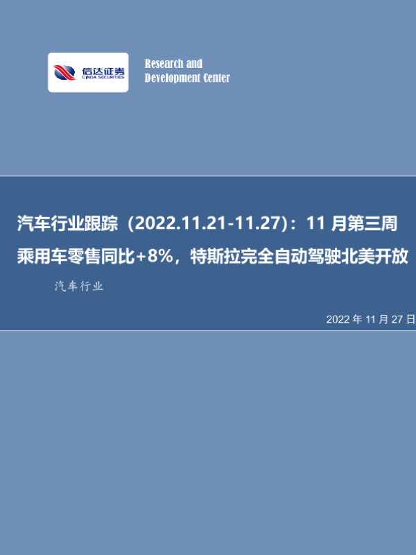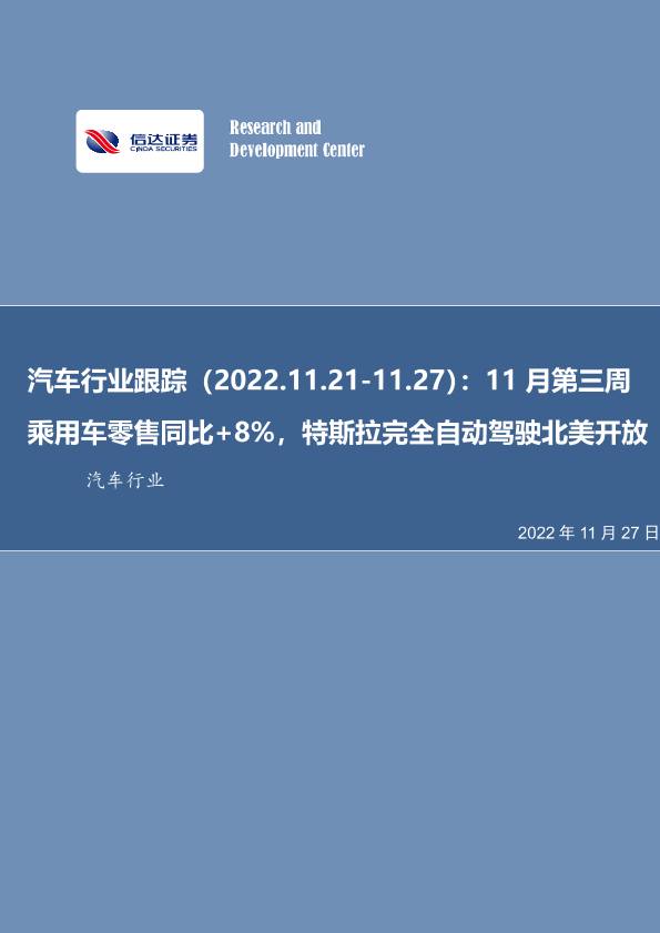 【信达证券】【20221127】汽车行业跟踪(11.21-11.27):11月第三周 乘用车零售同比+8%,特斯拉完全自动驾驶北美开放-21页