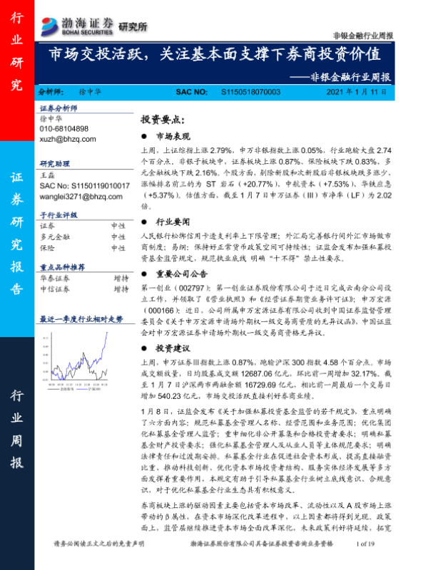 【渤海证券】【20210111】市场交投活跃,关注基本面支撑下券商投资价值-19页