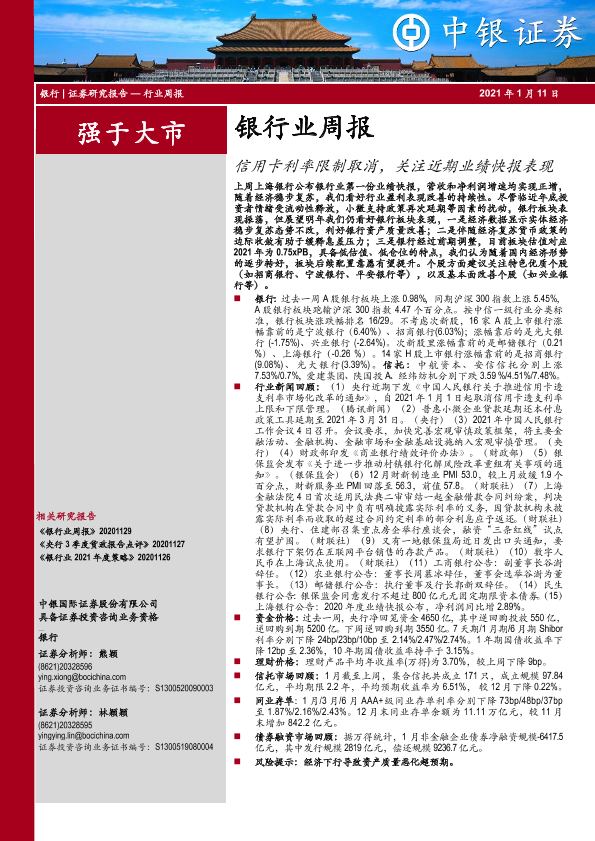 【中银证券】【20210111】银行业周报:信用卡利率限制取消,关注近期业绩快报表现-15页