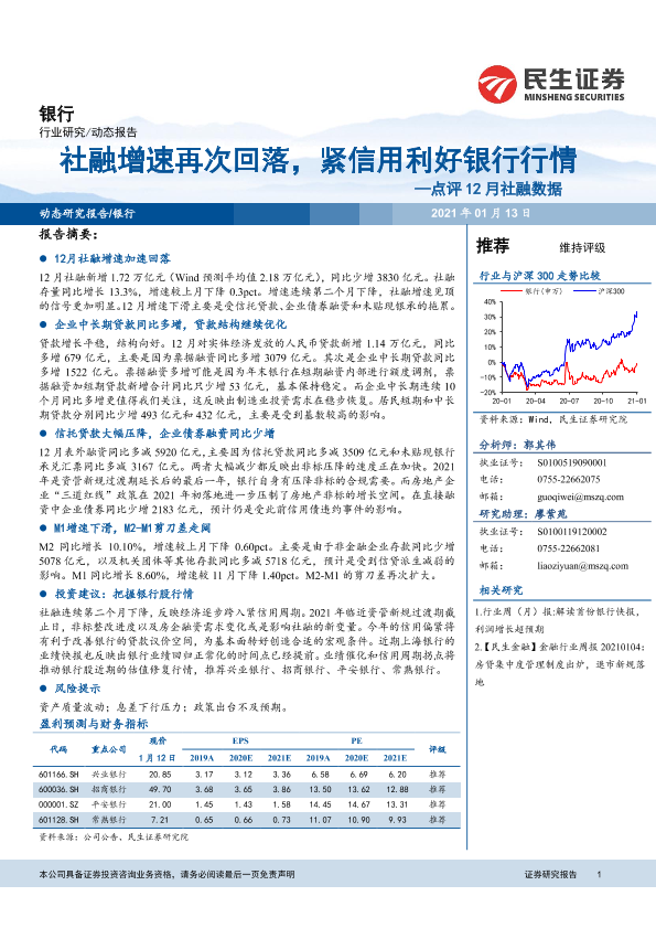 【民生证券】【20210113】社融增速再次回落,紧信用利好银行行情-6页