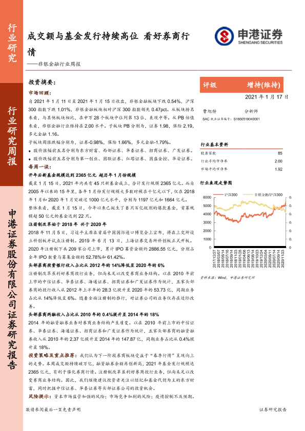 【申港证券】【20210117】非银金融行业周报:成交额与基金发行持续高位 看好券商行情-14页