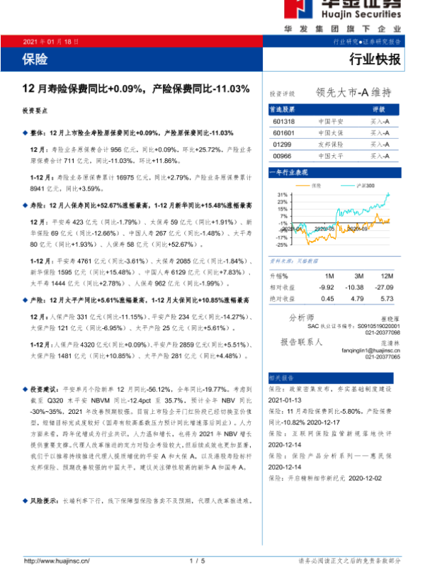 【华金证券】【20210118】12月寿险保费同比+0.09%,产险保费同比-11.03%-5页