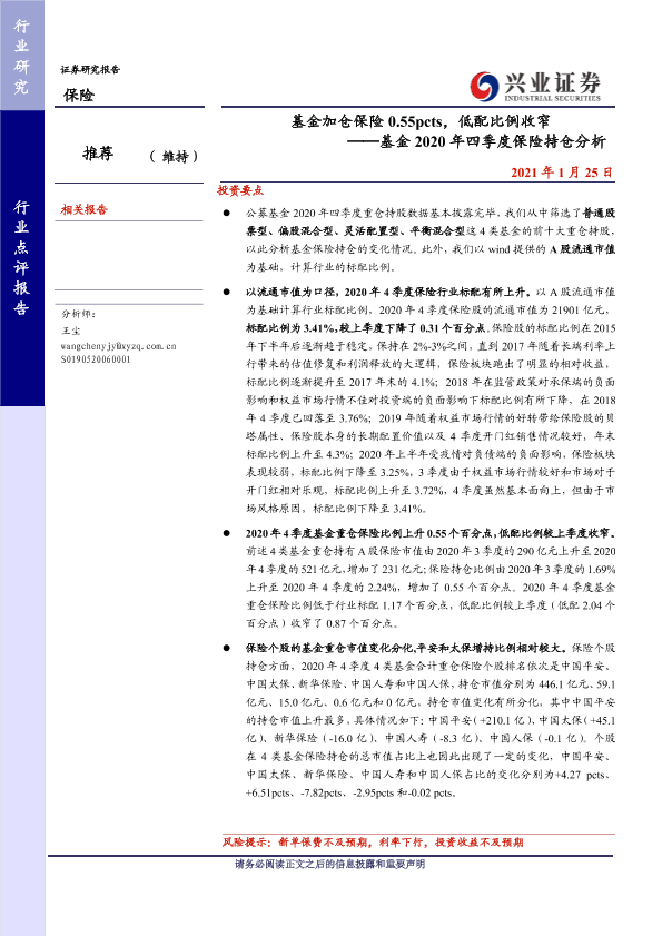 【兴业证券】【20210125】基金2020年四季度保险持仓分析:基金加仓保险0.55pcts,低配比例收窄-5页