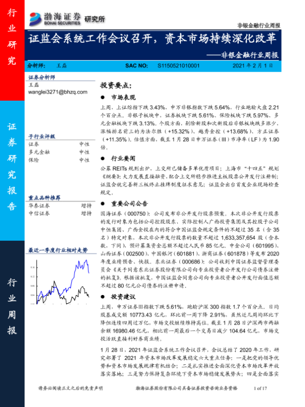 【渤海证券】【20210201】非银金融行业周报:证监会系统工作会议召开,资本市场持续深化改革-17页