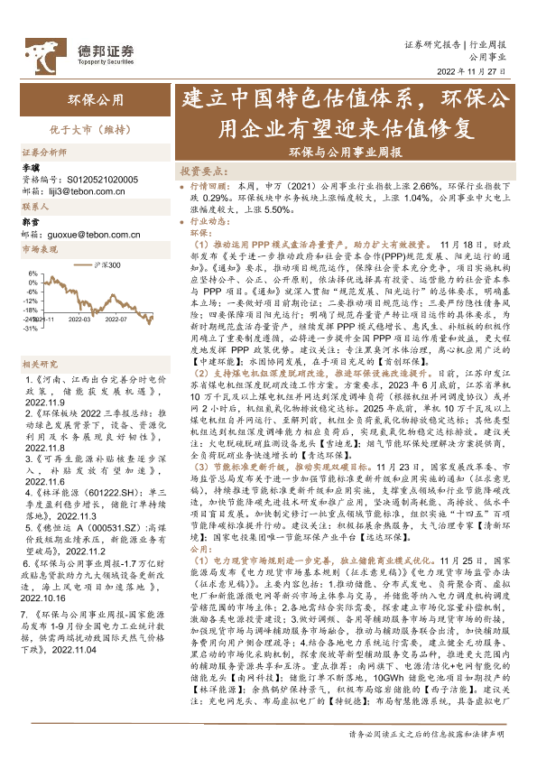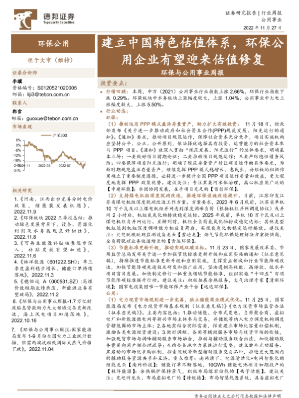 【德邦证券】【20221127】环保与公用事业行业周报:建立中国特色估值体系,环保公用企业有望迎来估值修复-21页