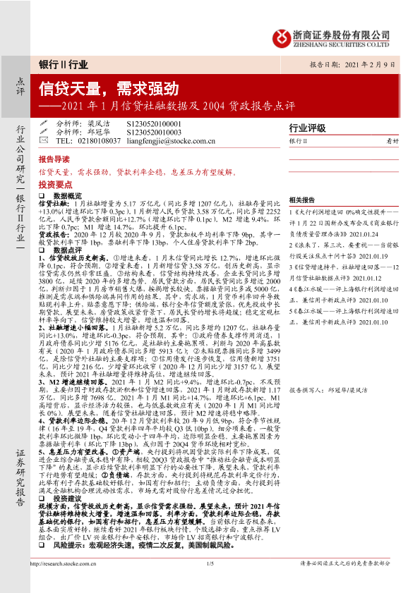 【浙商证券】【20210209】2021年1月信贷社融数据及20Q4货政报告点评:信贷天量,需求强劲-5页