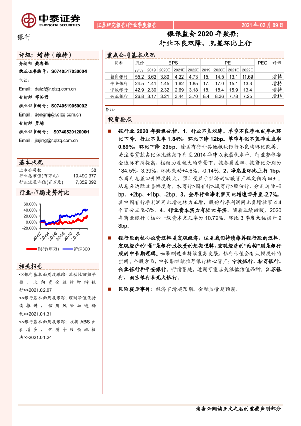 【中泰证券】【20210209】银保监会2020年数据:行业不良双降、息差环比上行-10页