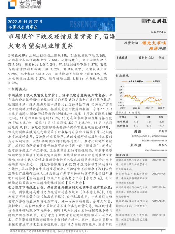 【安信证券】【20221127】环保及公用事业行业周报:市场煤价下跌及疫情反复背景下,沿海火电有望实现业绩复苏-15页