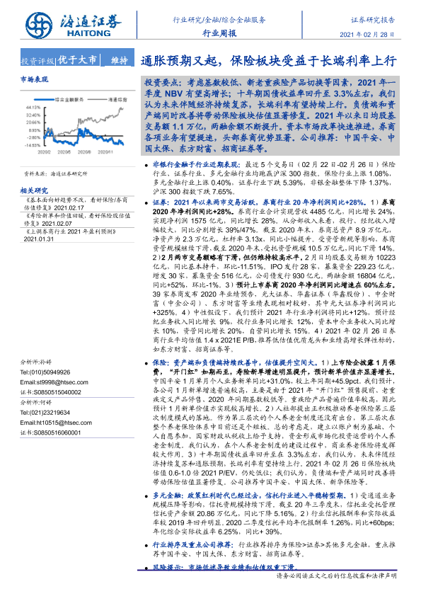 【海通证券】【20210228】综合金融服务行业周报:通胀预期又起,保险板块受益于长端利率上行-10页