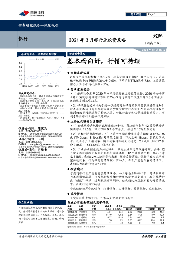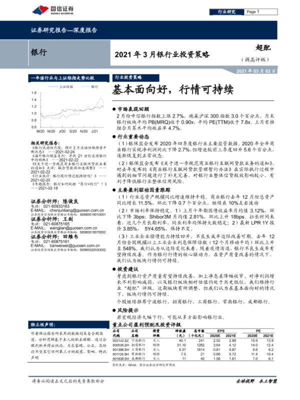 【国信证券】【20210302】2021年3月银行业投资策略:基本面向好,行情可持续-9页
