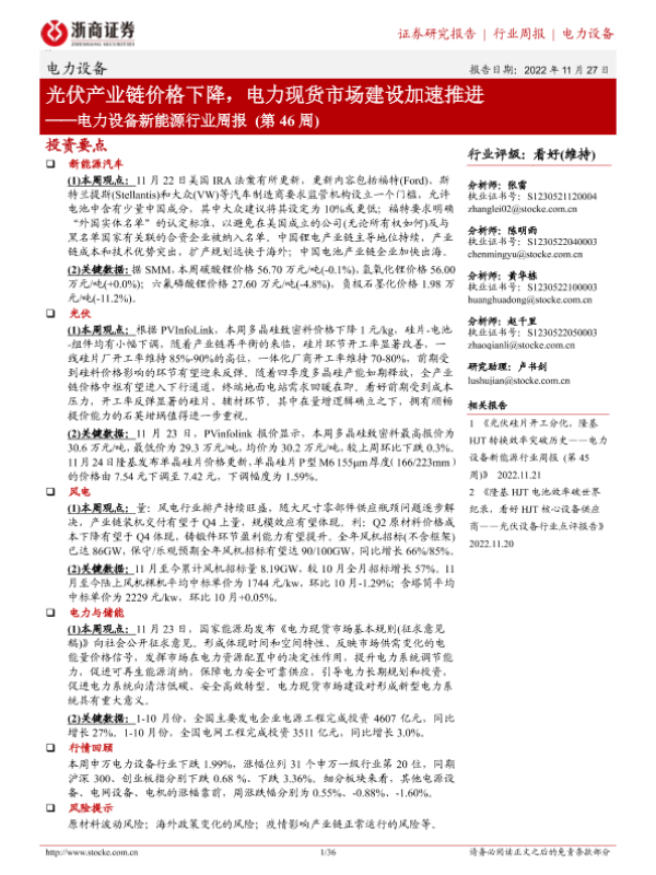 【浙商证券】【20221127】电力设备新能源行业周报(第46周):光伏产业链价格下降,电力现货市场建设加速推进-36页