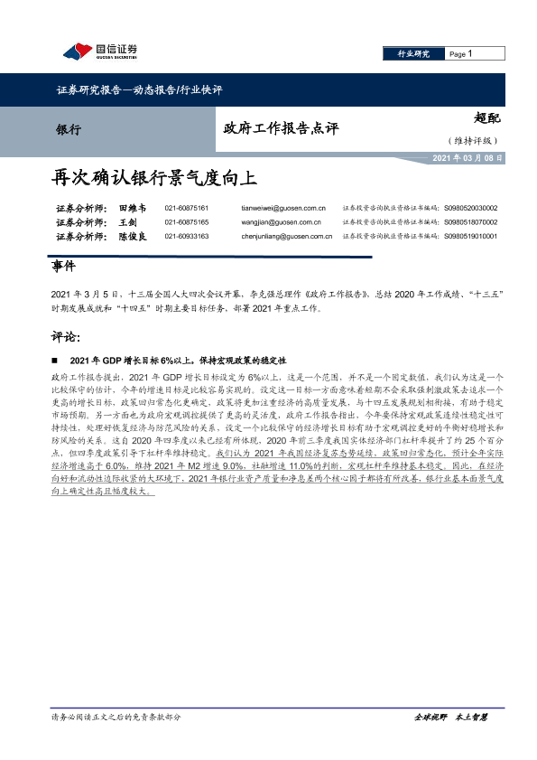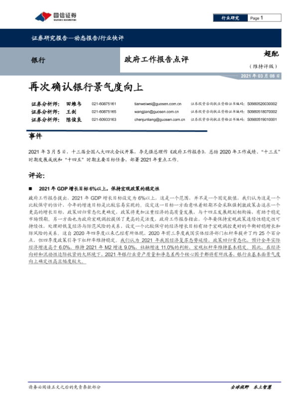 【国信证券】【20210308】银行政府工作报告点评:再次确认银行景气度向上-5页