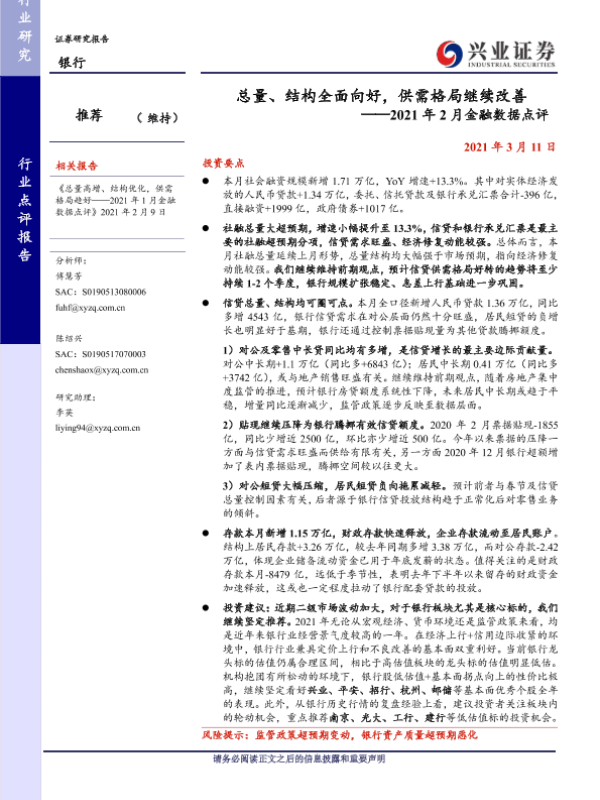 【兴业证券】【20210311】2021年2月金融数据点评-总量、结构全面向好,供需格局继续改善-7页