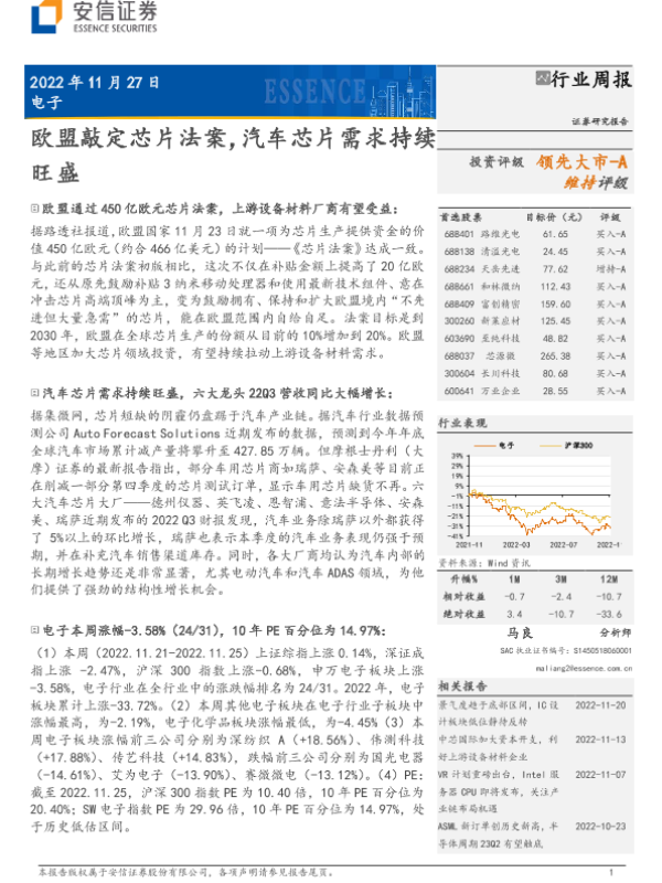 【安信证券】【20221127】电子行业周报:欧盟敲定芯片法案,汽车芯片需求持续旺盛-15页