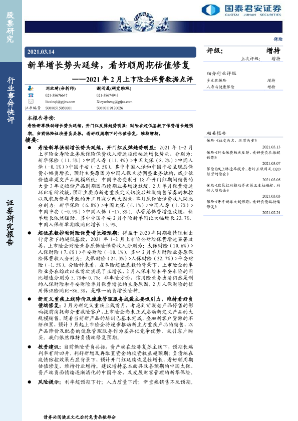 【国泰君安证券】【20210314】2021年2月上市险企保费数据点评:新单增长势头延续,看好顺周期估值修复-5页