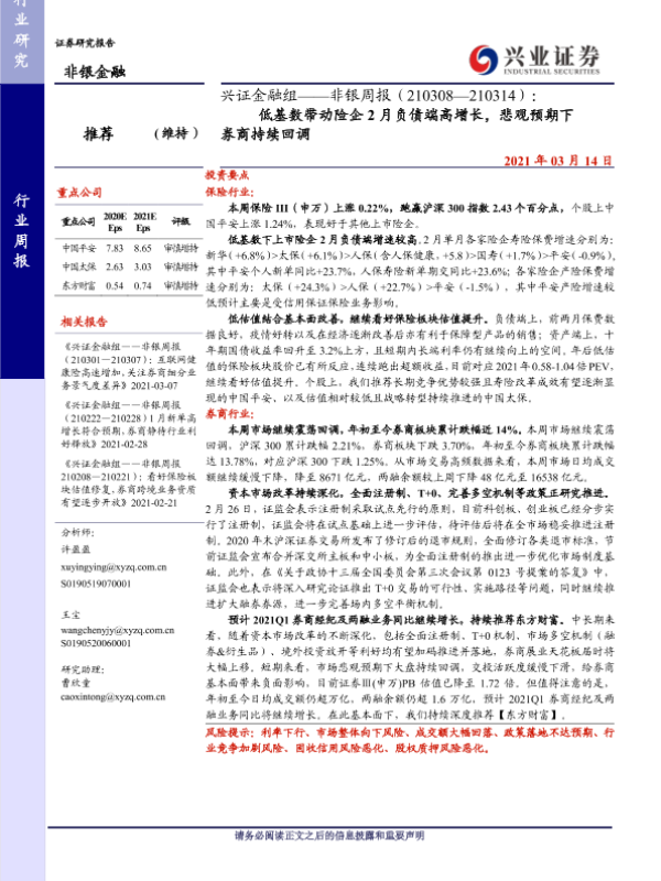 【兴业证券】【20210314】非银周报:低基数带动险企2月负债端高增长,悲观预期下券商持续回调-11页