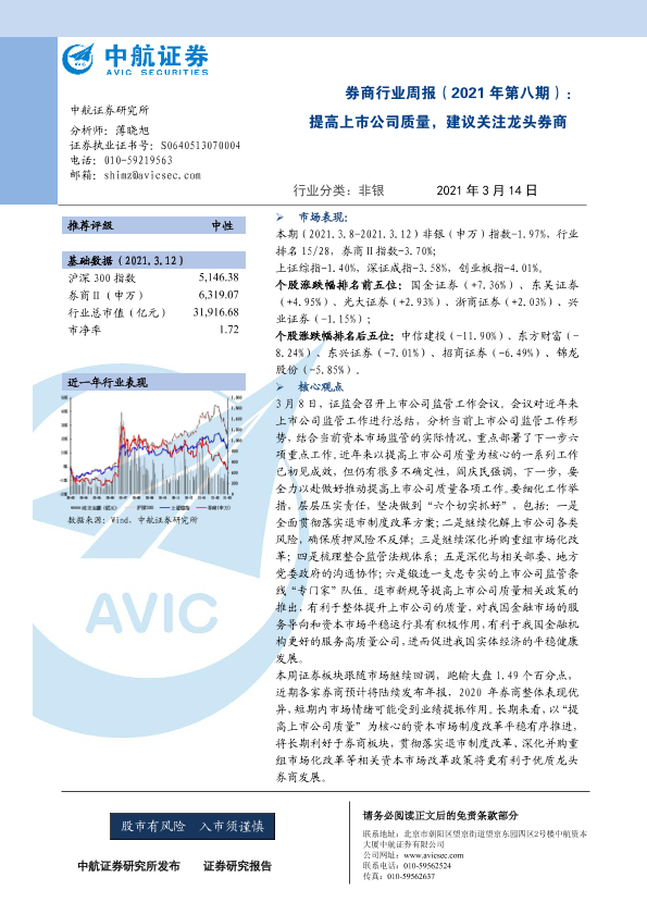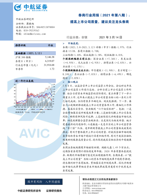 【中航证券】【20210314】券商行业周报(2021年第八期):提高上市公司质量,建议关注龙头券商-5页