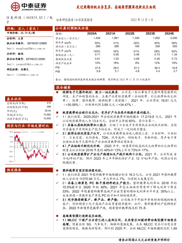【中泰证券】【20221201】电子:走过周期传统业务复苏,高端离型膜再造新成长曲线-37页