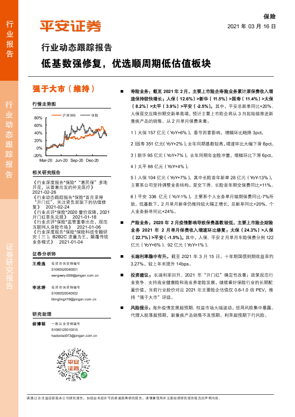 【平安证券】【20210316】保险行业动态跟踪报告:低基数强修复,优选顺周期低估值板块-8页