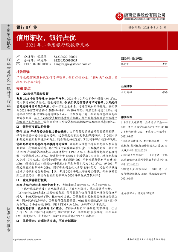 【浙商证券】【20210321】2021年二季度银行股投资策略:信用渐收,银行占优-5页